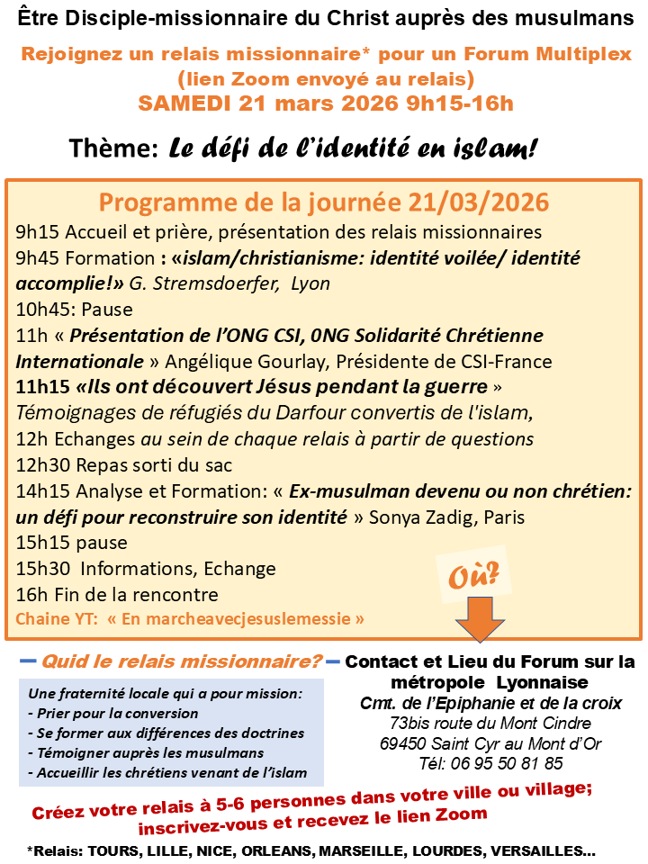 Samedi 21 mars 2026 de 9h15 à 16h, Forum multiplex sur le thème: « Le défi de l’identité en islam! » EPIPHANIE février 7, 2026 Uncategorized 0 Commentaire Navigation de l’article Previous Previous post: Samedi 7 mars 2026 de 8h à 8h30, venez participer en Zoom à l’intercession prophétique avec Marie pour porter la mission du Christ auprès des musulmans. Laisser un commentaire Annuler la réponseVotre adresse e-mail ne sera pas publiée. Les champs obligatoires sont indiqués avec *Commentaire * Nom * E-mail * Site web Enregistrer mon nom, mon e-mail et mon site dans le navigateur pour mon prochain commentaire.