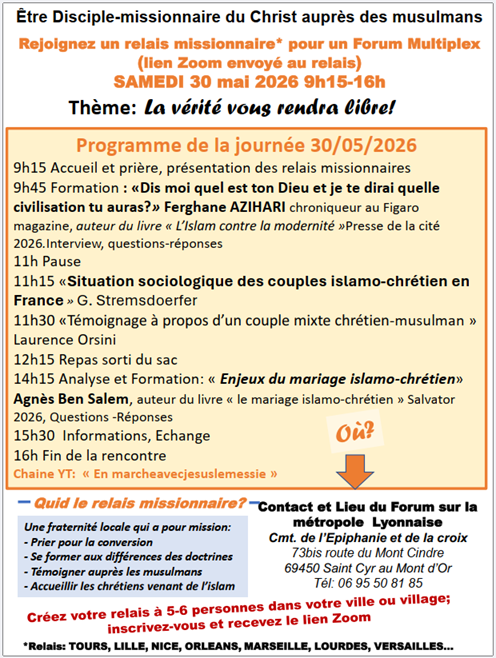 Samedi 30 mai 2026 de 9h15 à 16h, Forum multiplex. Thème: « La vérité vous rendra libre! »